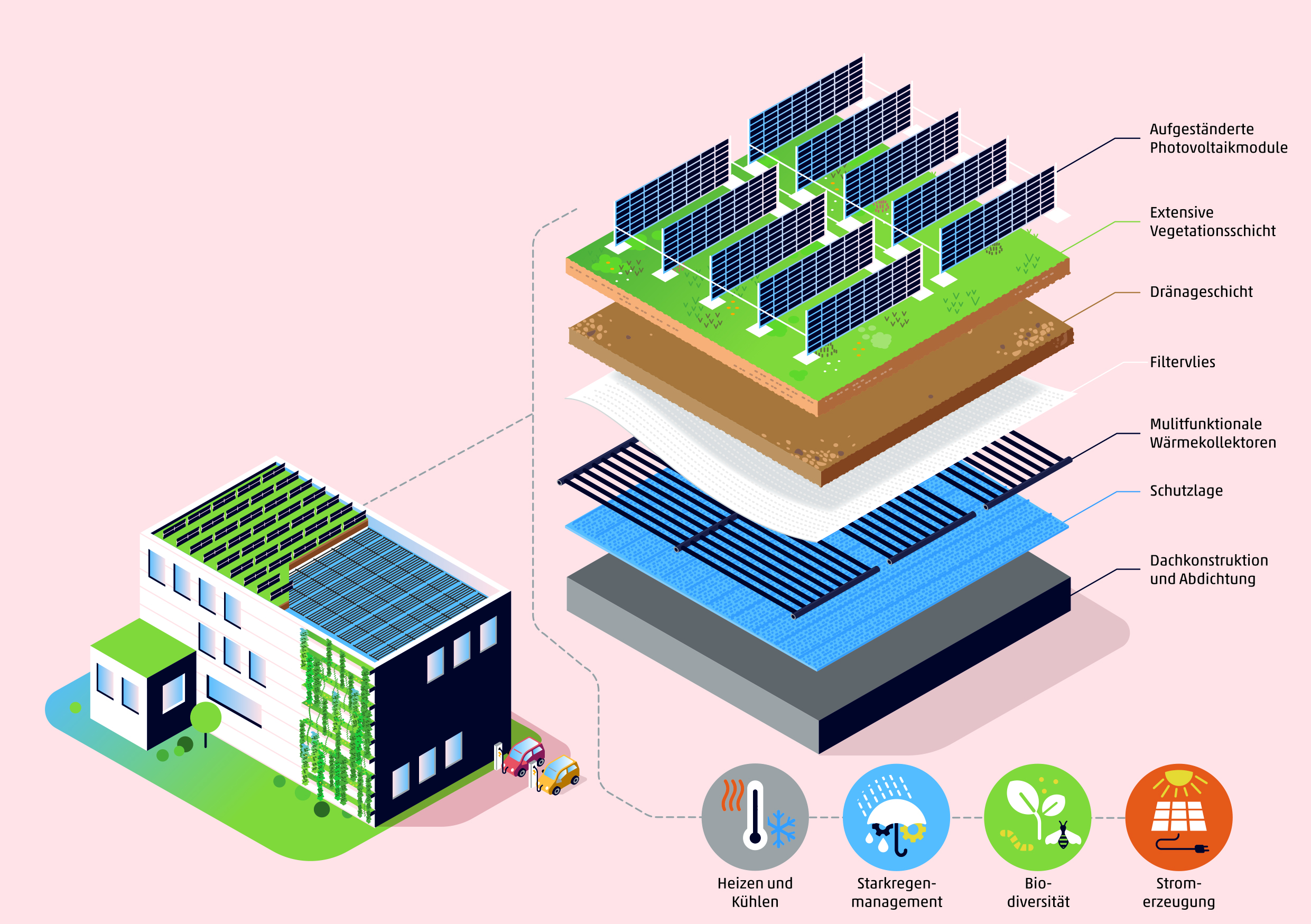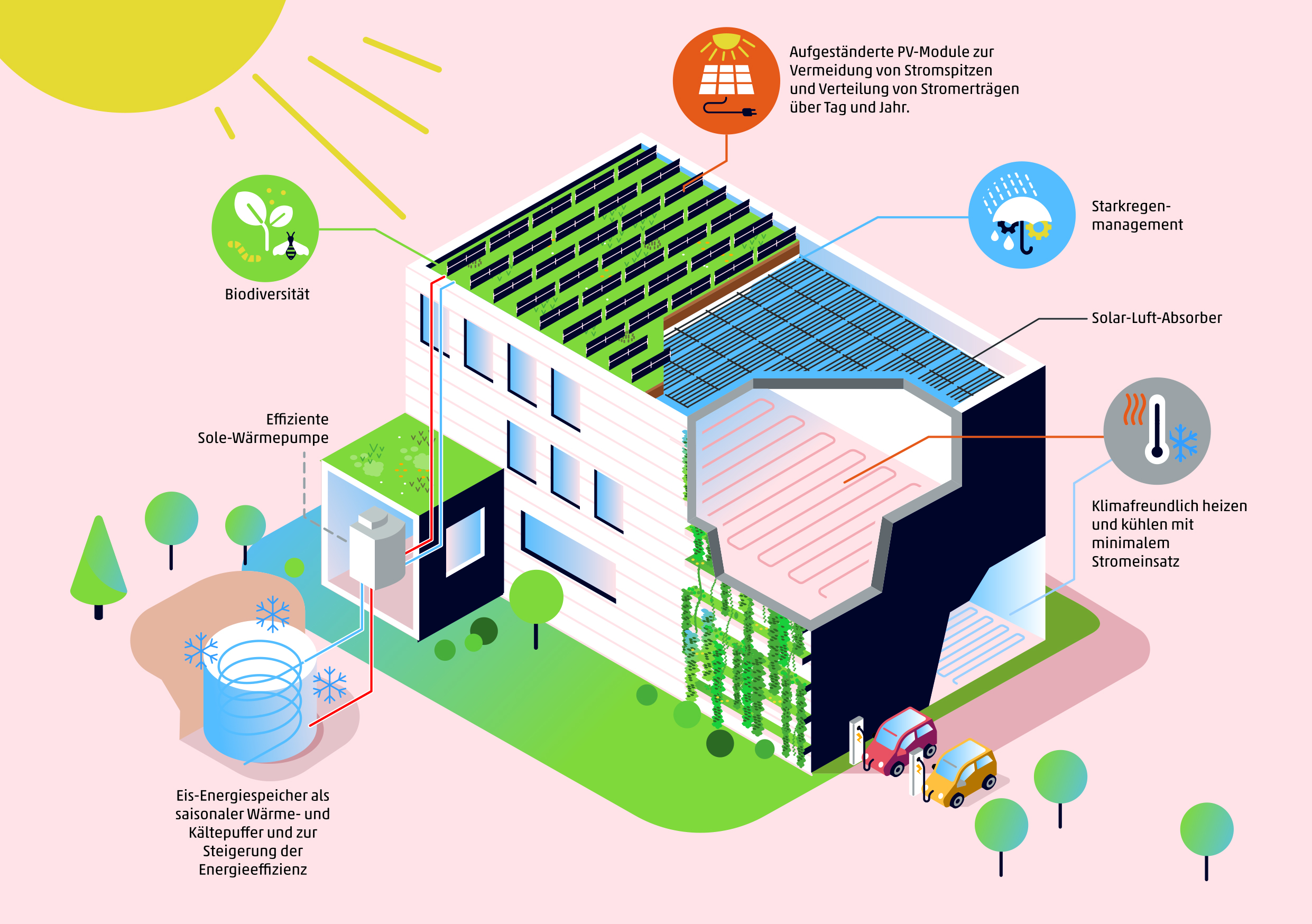 in hochwertigen Flachdächern, Dachbegrünung, Photovoltaik und Eis-Energiespeichern zu einem innovativen Gesamtsystem.